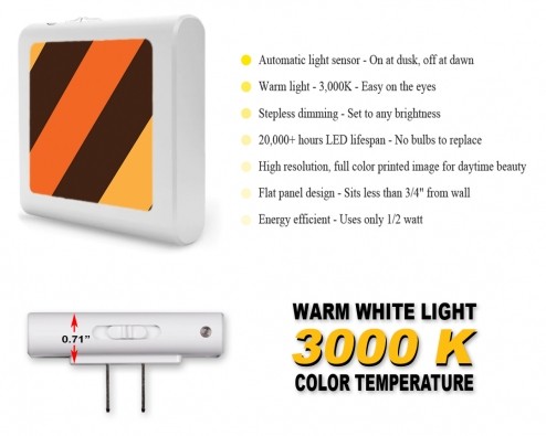 Power consumption is only 0.5 watt, no bulb replacement necessary, LED bulbs last up to 20,000 hours. UL Listed. Plug-in design for 110V - 120V Art Plates LED nightlights are small and compact. They sit less than 3/4 of an inch off the wall. When plugging into any standard outlet, the night light will not obstruct the second outlet. Images are printed in high resolution full color.