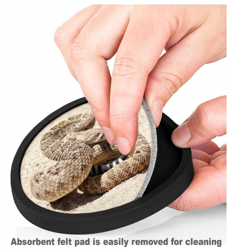 - SET OF 4 ABORBENT COASTERS: Set of four unique silicone and absorbent printed felt drink coasters that prevent drips, puddles, and water stains to your fine furniture. Suitable for indoors or outdoors. Works great for hot or cold drinks. Perfect for high humidity locations. Printed with colorful image of Rattle Snake