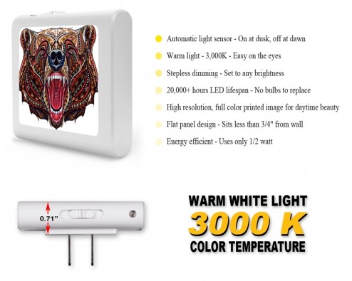 - ADJUSTABLE BRIGHTNESS - Our LED night light features a step less adjustment slider to adjust the brightness from 0 LM to 15 LM. You are able to set your desired brightness for different occasions to provide the best lighting experience. Beautifully printed Symmetrical Bear image.