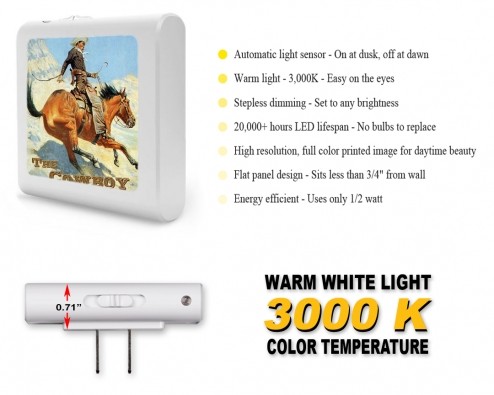 - ADJUSTABLE BRIGHTNESS - Our LED night light features a step less adjustment slider to adjust the brightness from 0 LM to 15 LM. You are able to set your desired brightness for different occasions to provide the best lighting experience. Beautifully printed Horse/The Cowboy image.