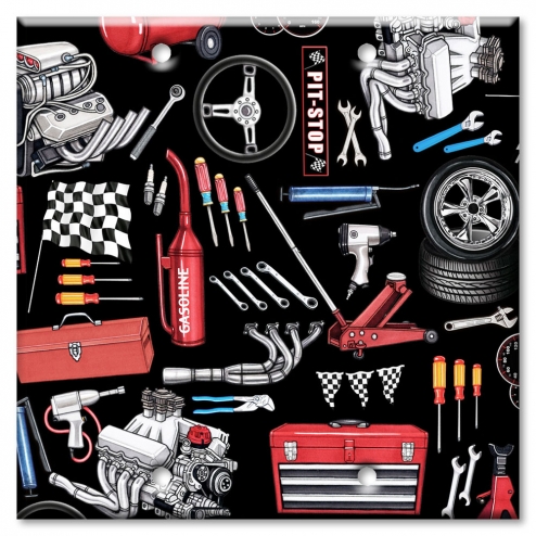 Art Plates - 2 Gang Blank Wall Plate / Switch Plate with Auto Mechanic Tools - Original Artwork ©Dan Morris, Dan Morris Design printed image. Art Plates switch plates are ideal for changing out boring plastic switch plates. Art Plates switch plates and outlet covers are created using a special, high resolution, ultra violet printer that prints directly on our American made, heavy duty, metal switch plates. There simply are no other decorated switch plates available that can compare to the richness of color and resolution that Art Plates can achieve. Every switch plate has a final UV cured high gloss finish. This creates an extremely durable shiny finish that also helps protect it from abrasions and scratches. Every switch plate comes beautifully and professionally packaged in see-through blister packaging and are great for gift giving. Color matched screws are included. All of our items are made in the USA.