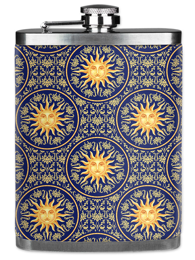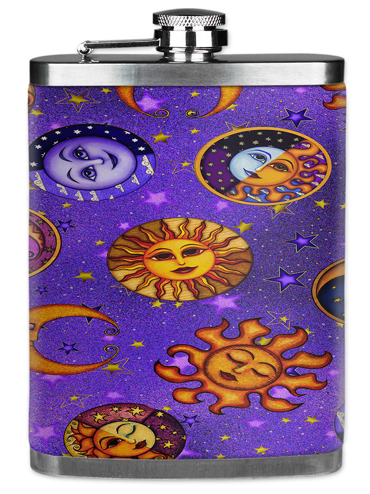 Space and Celestial themed Mugzie 7 ounce stainless steel Flasks with neoprene wet suit cover space and celestial printed images
