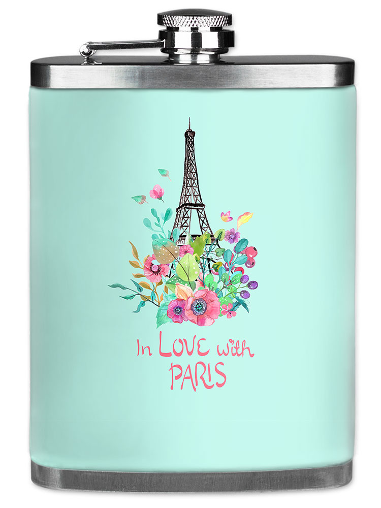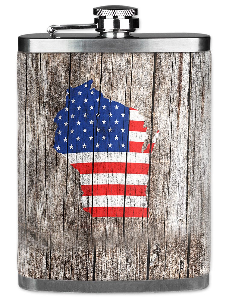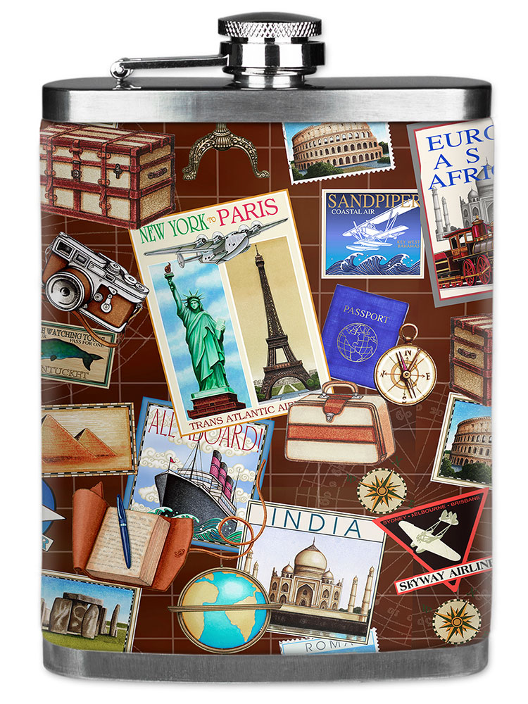 Travel and Americana themed Mugzie 7 ounce stainless steel Flasks with neoprene wet suit cover travel and americana printed images