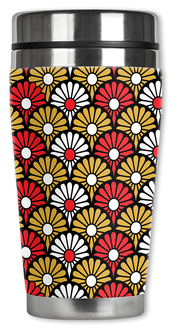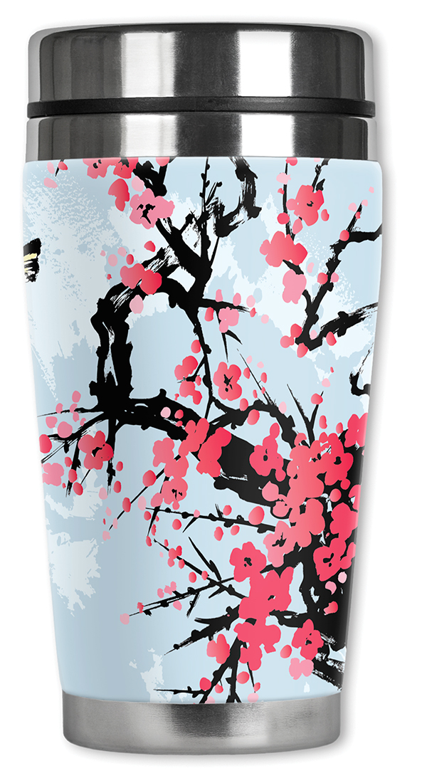 Asian themed Mugzie 16 ounce and 20 ounce stainless steel travel mugs with neoprene wet suit cover