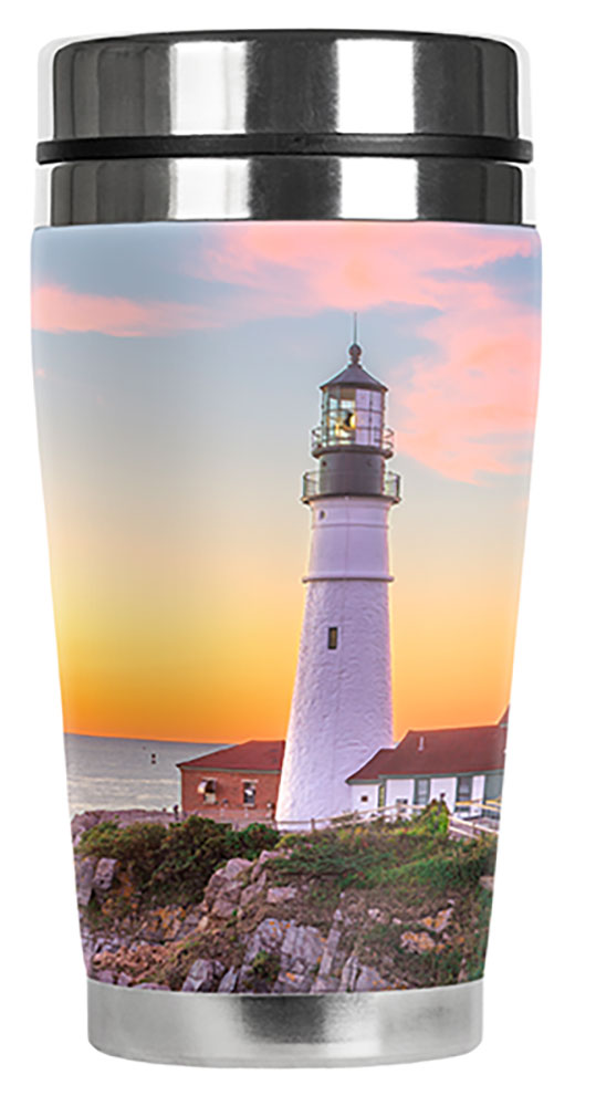 Lighthouse themed Mugzie 16 ounce and 20 ounce stainless steel travel mugs with neoprene wet suit cover