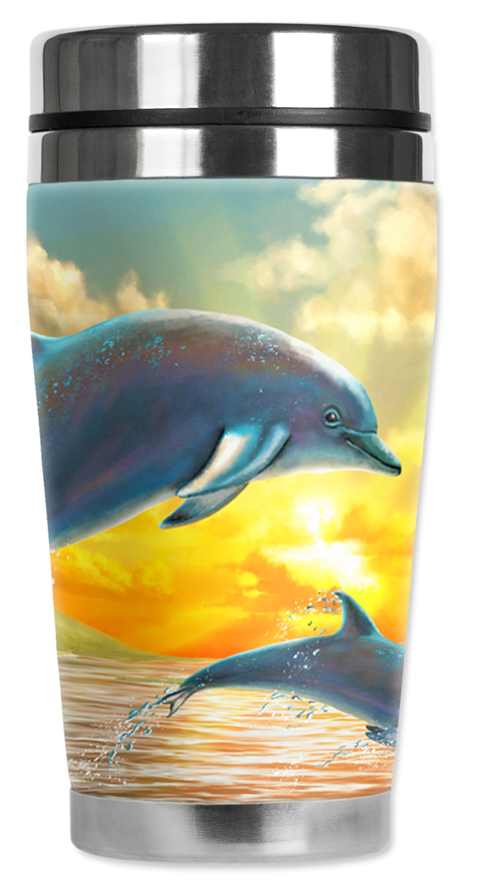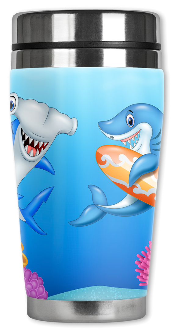 Sea Life themed Mugzie 16 ounce and 20 ounce stainless steel travel mugs with neoprene wet suit cover